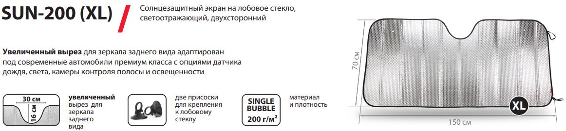 Ряд моделей солнцезащитных экранов имеют увеличенный вырез для зеркала заднего вида, оснащенного датчиками дождя, света, камеры контроля полосы и освещенности. Чаще всего такие зеркала можно встретить на современных автомобилях премиум–класса. Благодаря увеличенному вырезу, экран равномерно фиксируется на лобовом стекле автомобиля. (SUN 200, L, XL).