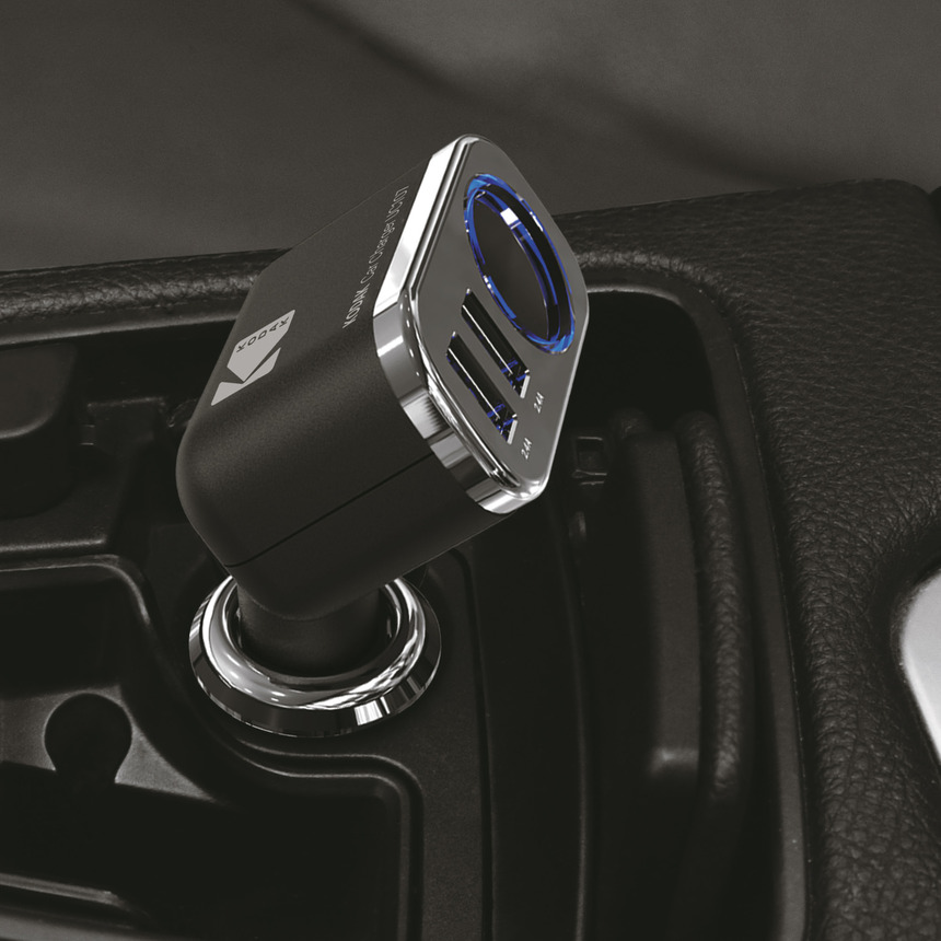 Разветвитель прикуривателя “KODAK”, 2 USB-порта с системой быстрой зарядки, по 2.4 А, дополнительное гнездо прикуривателя, 12-24 В.