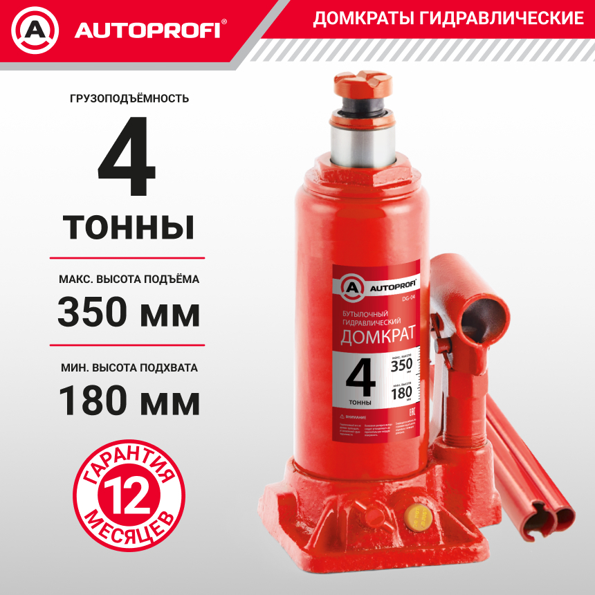 Домкрат бутылочный AUTOPROFI, гидравлический, 4 тонны, защита от перегруза, высота подъёма 180 - 350 мм.