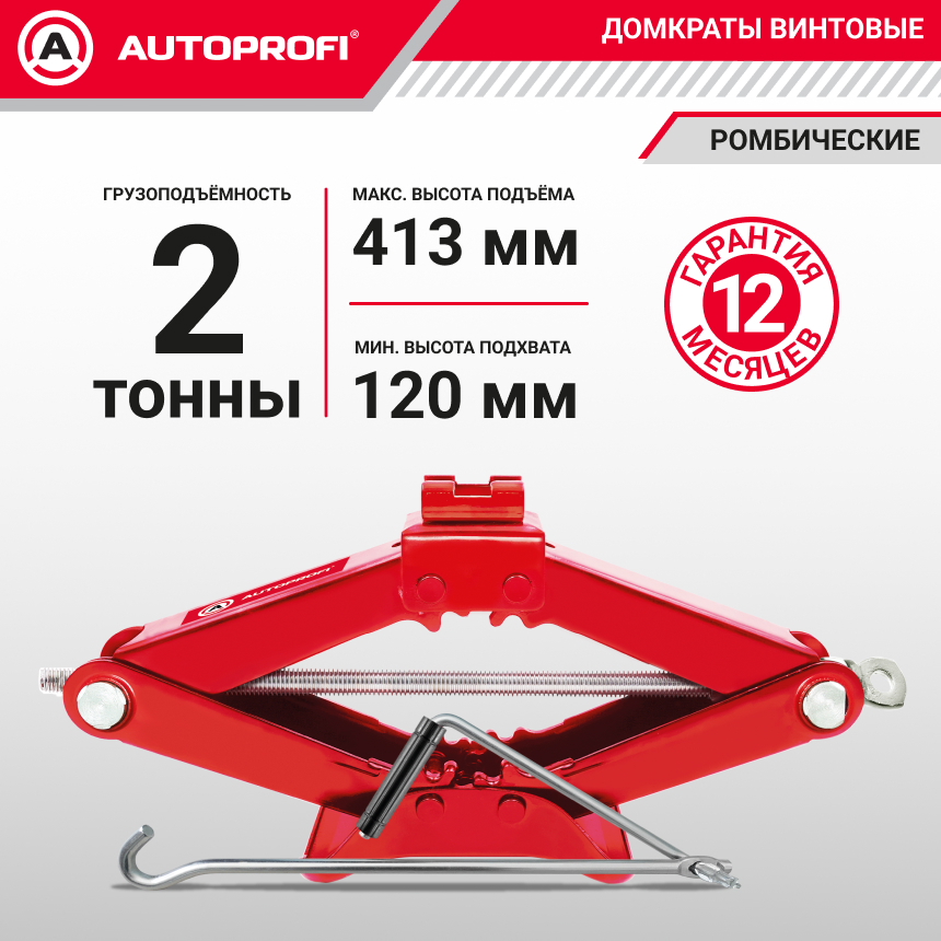 Домкрат ромбический AUTOPROFI, механический, винтовой, 2 тонны, высота подъёма 120 - 413 мм.