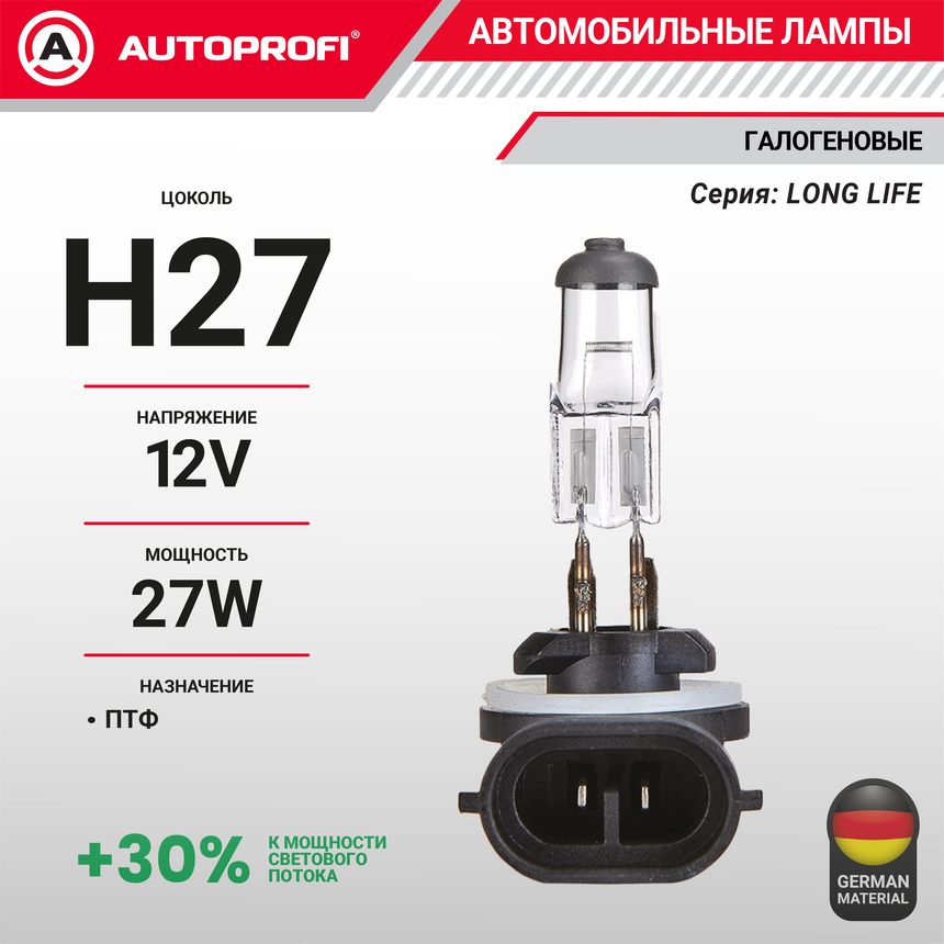 Лампа автомобильная галогенная H27, 12V, 27W, (PGJ13),1 шт, +30% LONG LIFE