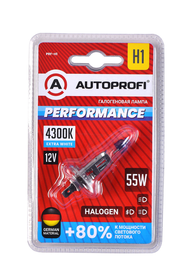 Линейка галогеновых ламп AUTOPROFI PERFORMANCE - лампы с улучшенными техническими характеристиками и световым потоком на 80% мощнее чем у стандартных галогеновых ламп. Расчетный срок службы в трое превышающий обычные лампы. Специальное нанесение на колбу обеспечивает более белый спектр свечения (4300К).