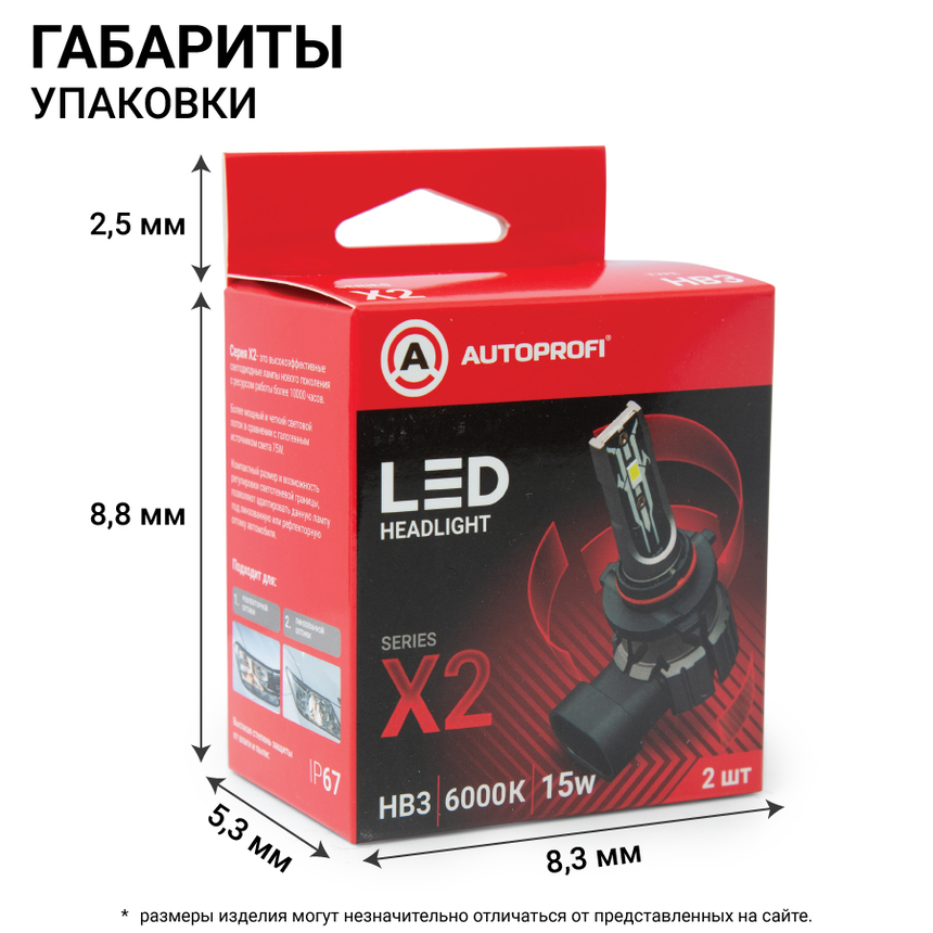 Лампа светодиодная Autoprofi, Х2 компак, HB3, 12V / 15W, 6000K, 4000 Lm, комплект 2 шт.