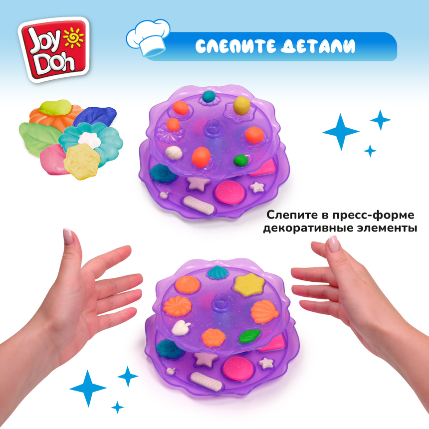 Масса для лепки Joy Doh, набор CUPCAKE TOWER - БАШНЯ СЛАДКОЕЖКИ, 3-х уровневая этажерка, 22 аксессуара, 4 баночки с тестом, (4 х 50 г.)