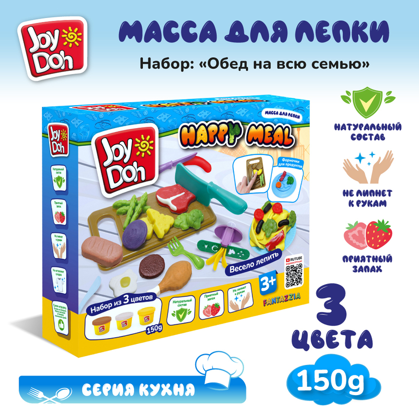 Масса для лепки Joy Doh, набор HAPPY MEAL - ОБЕД НА ВСЮ СЕМЬЮ, мн. блюд, 16 аксессуаров, 3 баночки с тестом, (3 x 50 г.)