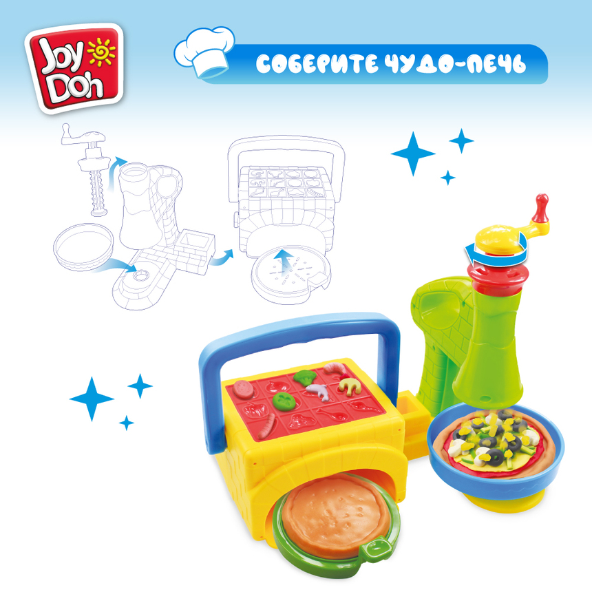 Ваш малыш любит пиццу? Набор для лепки «Pizza Maker Set» от Joy-Doh – это целая пиццерия в одном наборе! Ваш ребенок почувствует себя настоящим поваром. Чудо-печь для запекания пиццы с различными пресс-формами продуктов, машинка для терки сыра, настоящий нож и лопатка, все как на итальянской кухне. Зовите гостей и давайте испечем самую вкусную пиццу!