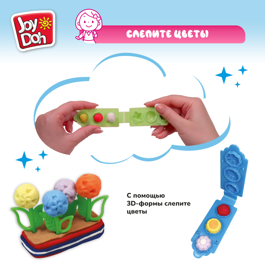 Масса для лепки Joy Doh, набор FLOWER FUN - ЦВЕТЫ, 3D формы цветов, 8 аксессуаров, 3 пакетика с тестом, (3 х 20г.)