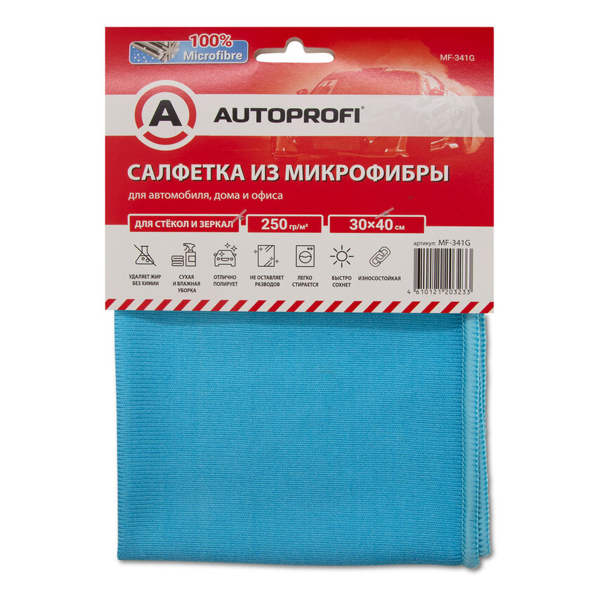 Салфетка из микрофибры "AUTOPROFI" для стёкол, 250 гр/м2., 30х40 см.,1шт. MF-341G