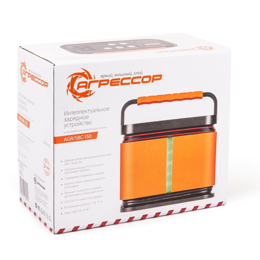 Цифровое зарядное устройство "Агрессор", 9 фаз зарядки, ток 2/6/10/15А, 12V/15А розетка, 5V/1A USB, для 12V АКБ (WET, AGM, GEL)