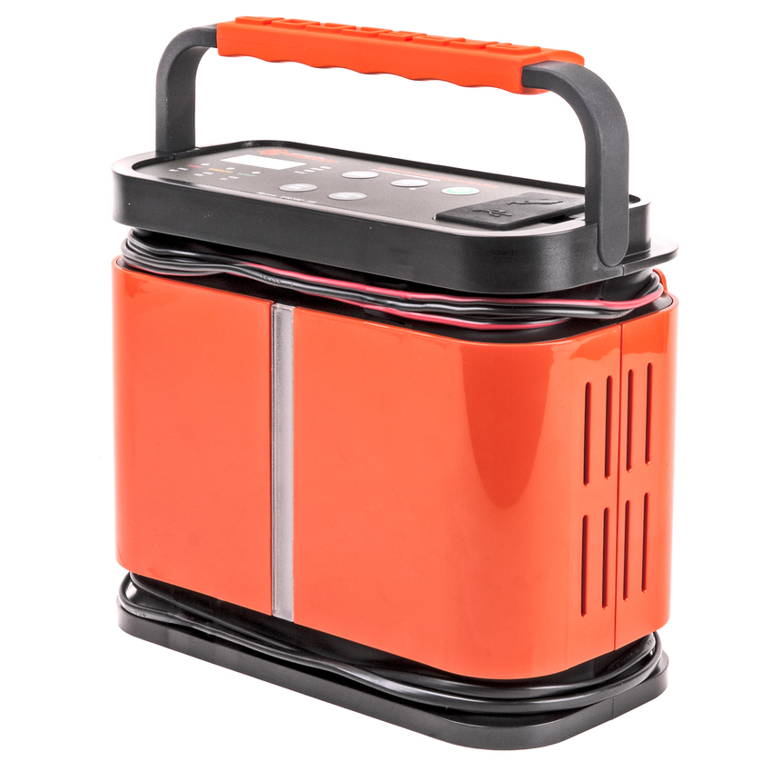 Компактное зарядное устройство с регулируемой силой тока: 2А для мотоциклов, снегоходов, газонокосилок, 6А для аккумуляторов емкостью 15-60 ампер-час, 10А для зарядки стандартных автомобильных аккумуляторов и 15А для больших АКБ с емкостью от 50 ампер-час. Также есть порт USB для подзарядки мобильных гаджетов. На панели устройства можно выбрать силу тока, тип АКБ, а также проверить напряжение батареи.